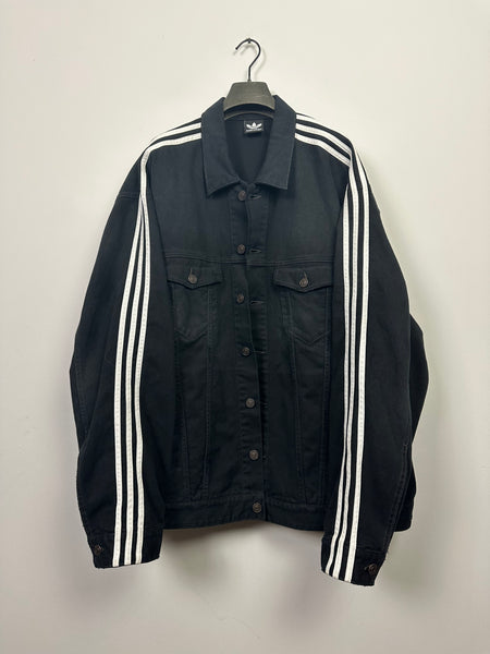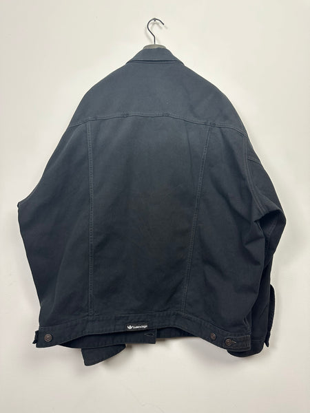 Tagged size 3, fits a free size (can accommodate up to a 3XL easily. Cut ridiculously wide, featuring a button closure, enormous armholes, and three inner pockets. In good condition, lightly worn but all signs of distressing are design features. Iconic three stripe motif down the arms.