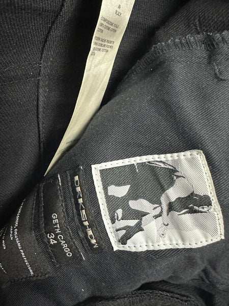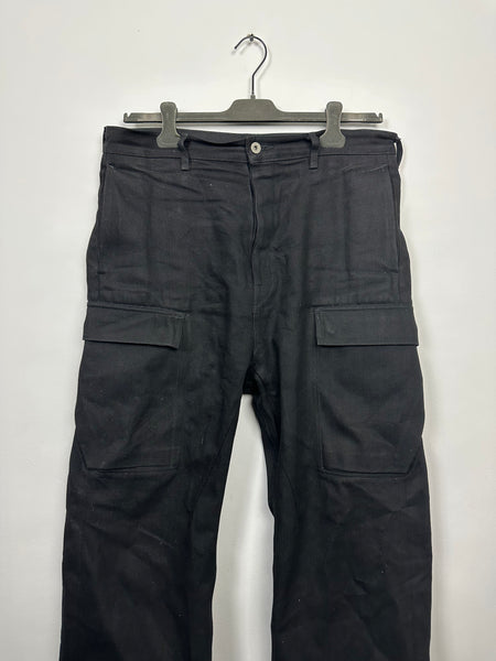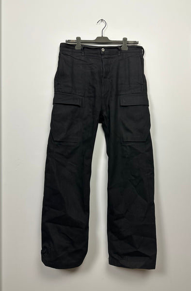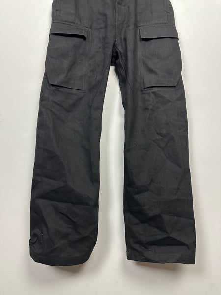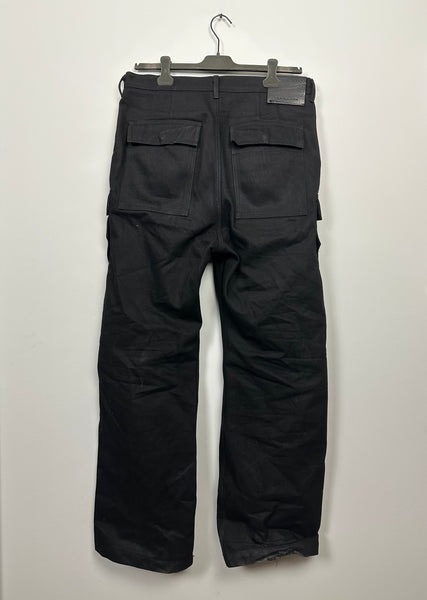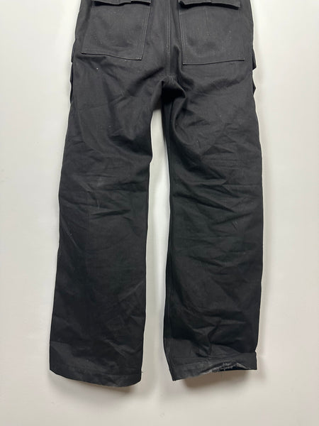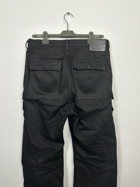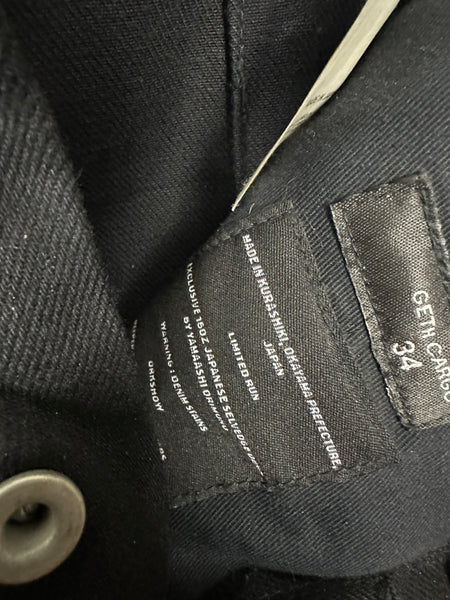 Tagged size 34 and fits true to size. In great condition, worn a handful of times with only damage being minor heelbite. Constructed from a heavy and stiff 16oz black denim. Features a button fly closure and cargo pocket on either leg.