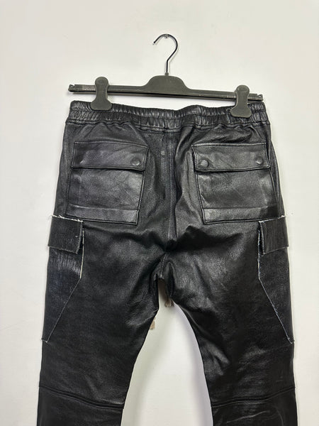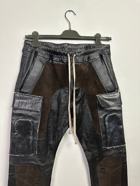 Tagged size 50 and fits true to size, can accommodate a 32 as well due to elasticized waist. Featured on the LARRY runway and features two coated cotton cargo pockets, as well as brown suede paneling on the legs and groin area. Constructed from a beautiful black lambskin.
