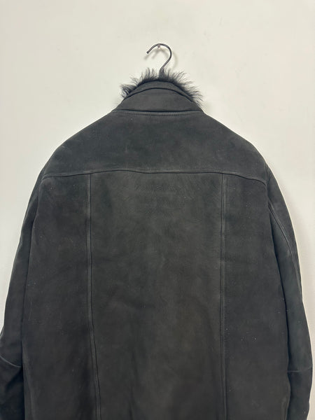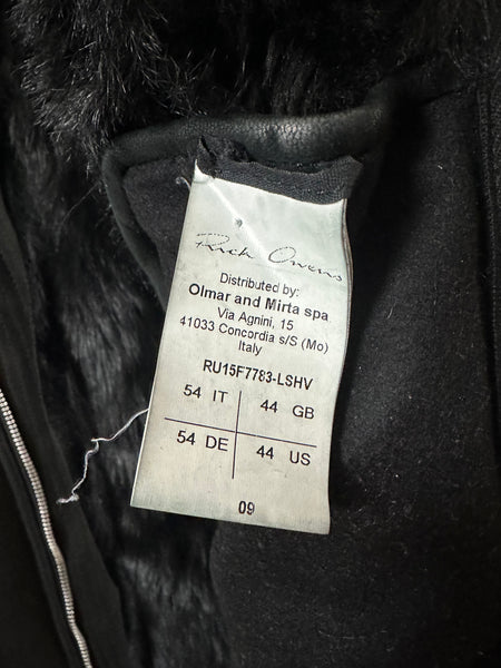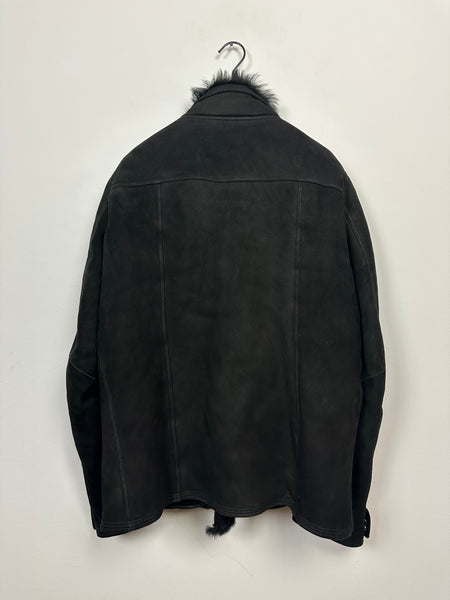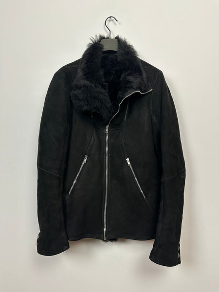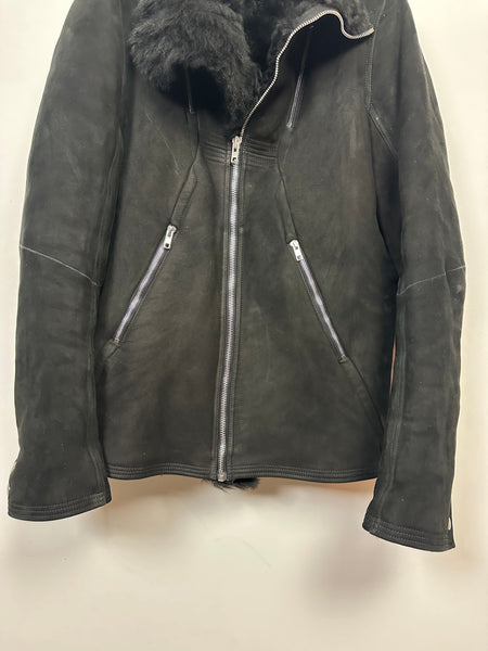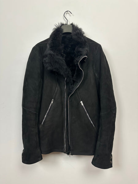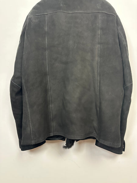 Tagged size 54 and fits true to size. In pristine condition with no rips, stains or tears. Constructed from a heavy shearling lined lamb, with long haired shearling. Features a zipper closure and two zipped pockets on torso.