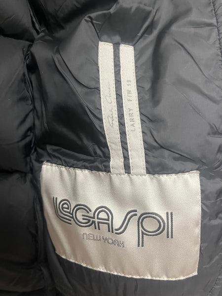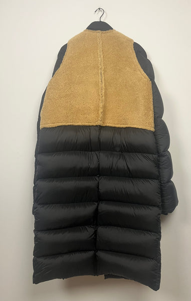 Tagged size 50 and fits a 48-52 comfortably. In incredible condition with no rips, stains or tears as well as no matting to the shearling back panel. Constructed from a plush nylon and filled with goose down. Features a contrasting rust shearling panel on the back, as well as rounded zionic shoulders and a snap button closure.