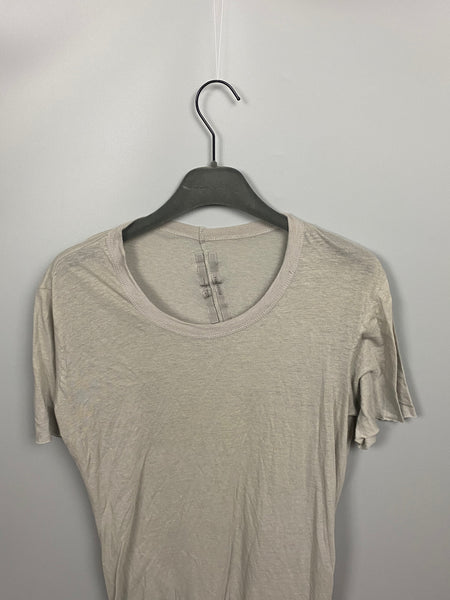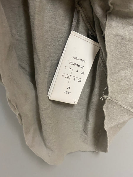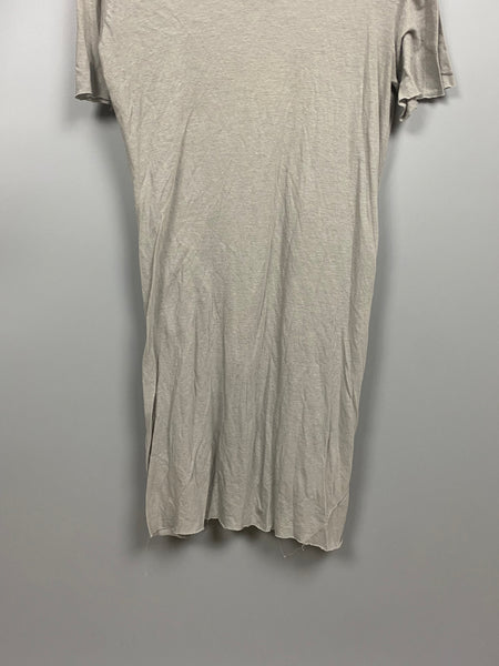Tagged size S, quite stretchy can accommodate S-M.In incredible condition with no rips, stains or tears.In season exclusive colourway called TEAR which is between DINGE and DUST.Asymmetrical seam in the back to allow the tee to hug the body.
